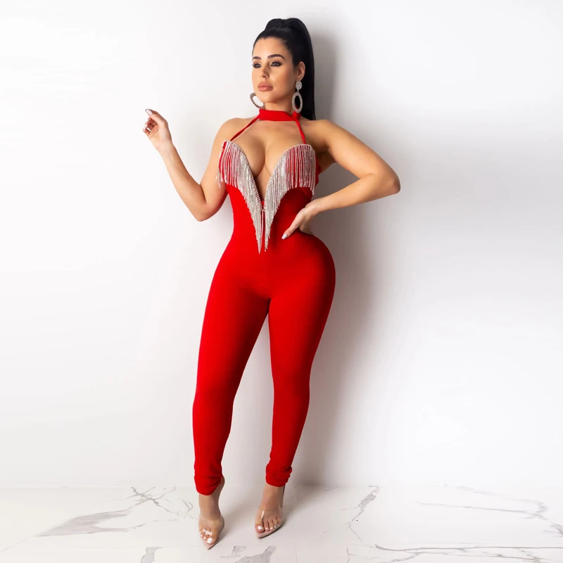 Sexy Jumpsuit Women Sleeveless Halter Backless Sequin Tassel Night Club Party Jumpsuit One Piece Ju