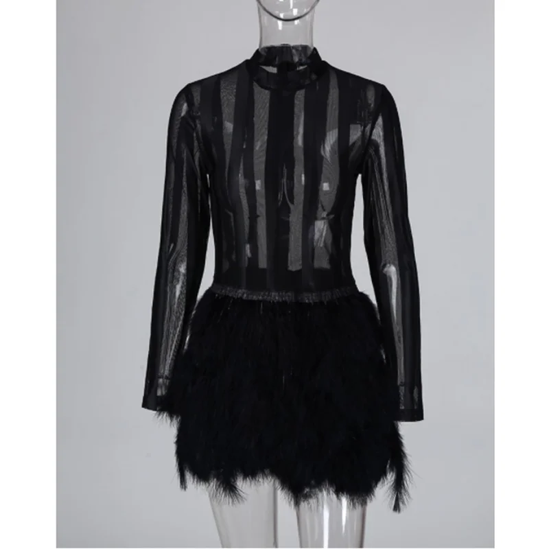 Feathers Design Mesh Dress Women Black Transparent Bodycon Dresses Autumn 2019 Sexy Night Club Part